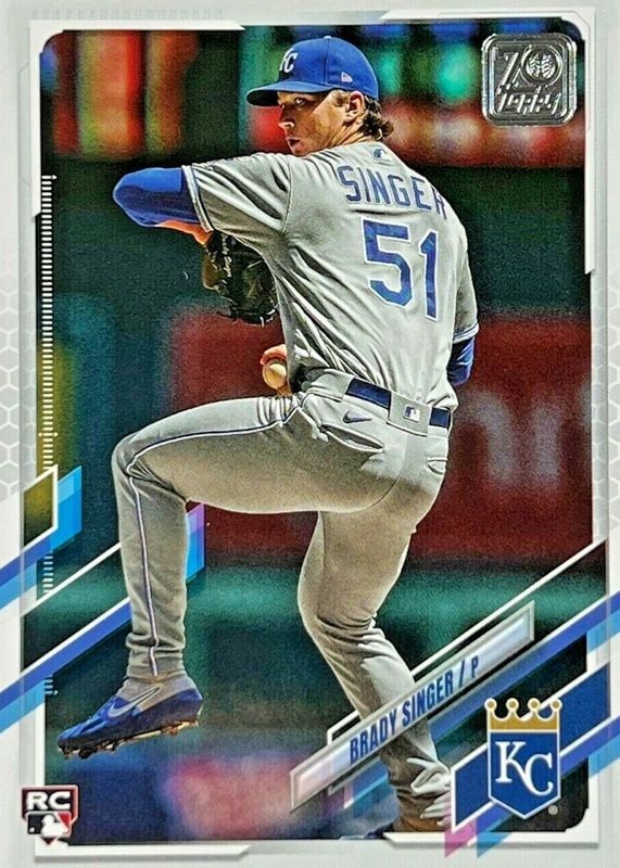The Brady Singer 2021 Topps #169 SP Variation Rookie card in Raw condition has not changed in price in the last 30 days and was last sold for $6.58 .