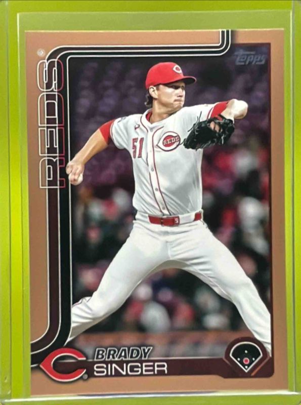 The Brady Singer 2025 Topps Update #US344 Gold /2025 card is 1 of 57 Brady Singer's card variations in the 2025 Topps Update set being tracked by Sports Card Investor, including Base, Aqua Holo Foil, Aqua Rainbow Foil, Diamante Foil, and Holiday.
