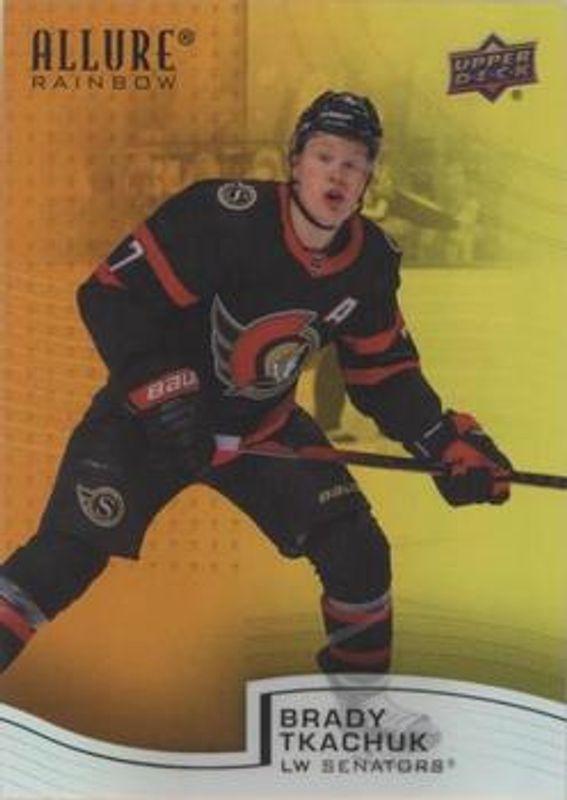 The Brady Tkachuk 2021 Upper Deck Allure #R-67 Rainbow Orange - Yellow card is 1 of 42 Brady Tkachuk's card variations in the 2021 Upper Deck Allure set being tracked by Sports Card Investor, including Base, Black Rainbow, Blue China, Orange Slice die-cut, and Pink Blue Leopard.