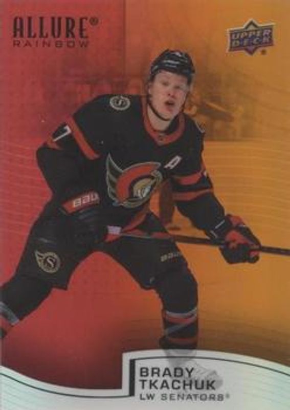 The Brady Tkachuk 2021 Upper Deck Allure #R-67 Rainbow Red - Orange card is 1 of 42 Brady Tkachuk's card variations in the 2021 Upper Deck Allure set being tracked by Sports Card Investor, including Base, Black Rainbow, Blue China, Orange Slice die-cut, and Pink Blue Leopard.
