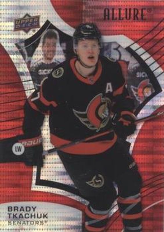 The Brady Tkachuk 2021 Upper Deck Allure #19 Red Rainbow card is 1 of 42 Brady Tkachuk's card variations in the 2021 Upper Deck Allure set being tracked by Sports Card Investor, including Base, Black Rainbow, Blue China, Orange Slice die-cut, and Pink Blue Leopard.