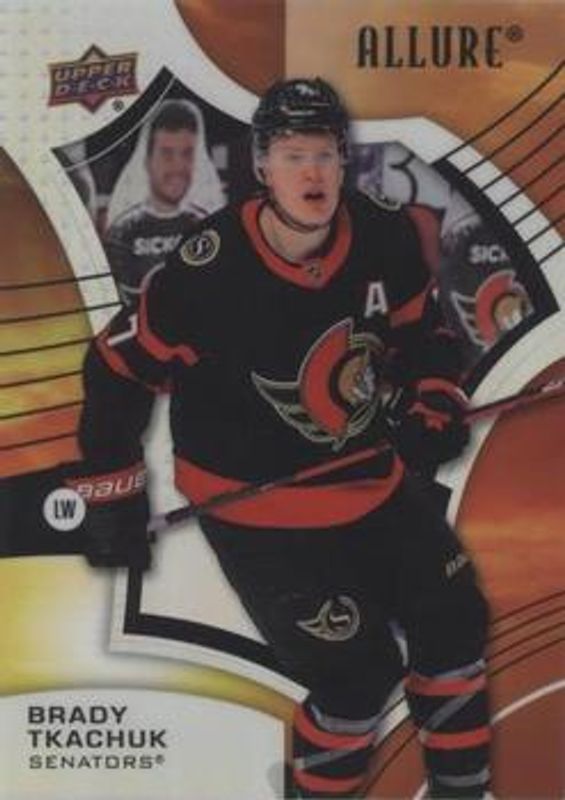 The Brady Tkachuk 2021 Upper Deck Allure #19 Sunrise card is 1 of 42 Brady Tkachuk's card variations in the 2021 Upper Deck Allure set being tracked by Sports Card Investor, including Base, Black Rainbow, Blue China, Orange Slice die-cut, and Pink Blue Leopard.