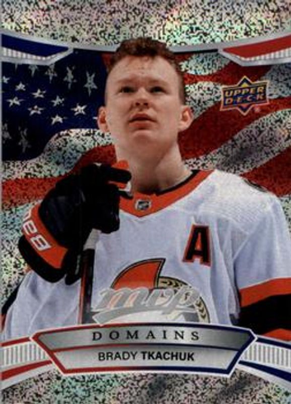 The Brady Tkachuk 2022 Upper Deck MVP #NA-11 Domains card is 1 of 33 Brady Tkachuk's card variations in the 2022 Upper Deck MVP set being tracked by Sports Card Investor, including Base, Blue Script, Gold Script, Ice Battles, and Silver Script.