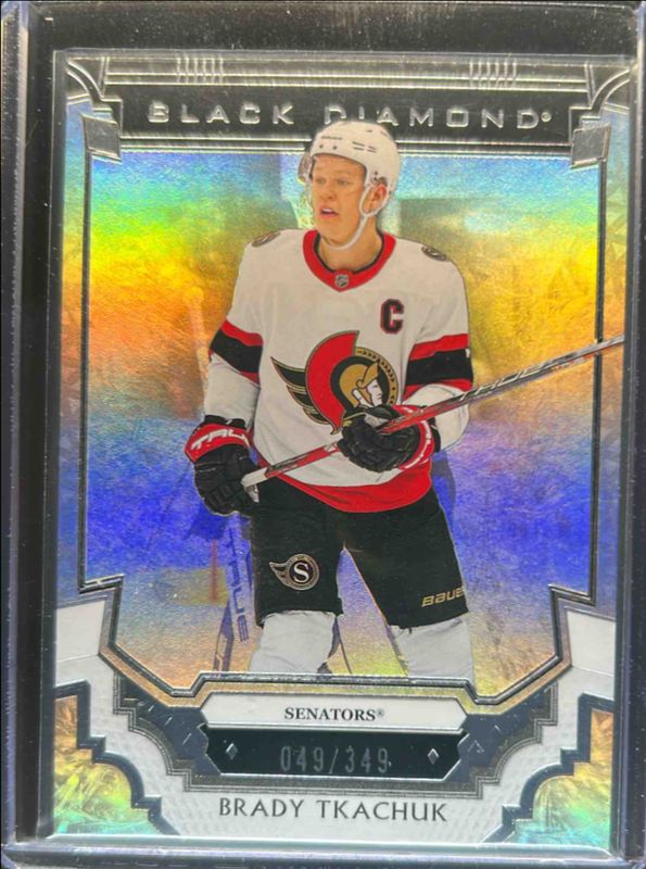 The Brady Tkachuk 2023 Upper Deck Black Diamond #BDB-BT Base /349 card is 1 of 20 Brady Tkachuk's card variations in the 2023 Upper Deck Black Diamond set being tracked by Sports Card Investor, including Red /75, Blue /25, Pure Black Auto /25, Green /10, and Diamond Relics /5.