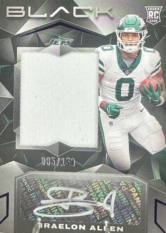 This card is 1 of 7 Braelon Allen's card variations in the 2024 Black set being tracked by Sports Card Investor, including Rookie Patch Auto (/249), Rookie Patch Auto - Citrine /50, Rookie Patch Auto - Emerald /25, Rookie Patch Auto - Ruby /15, and Rookie Patch Auto - Gold /10.