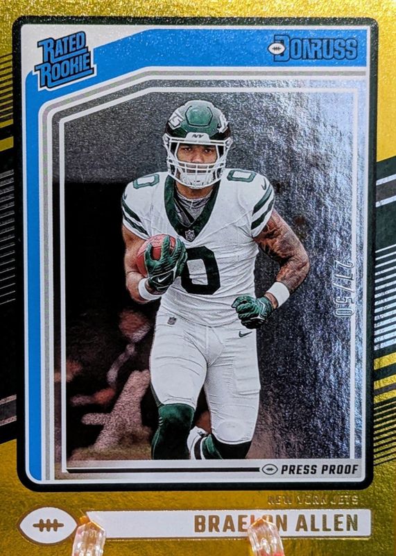 The Braelon Allen 2024 Donruss #306 Press Proof Gold /50 Rookie card in Raw condition has not changed in price in the last 30 days and was last sold for $7.50 .