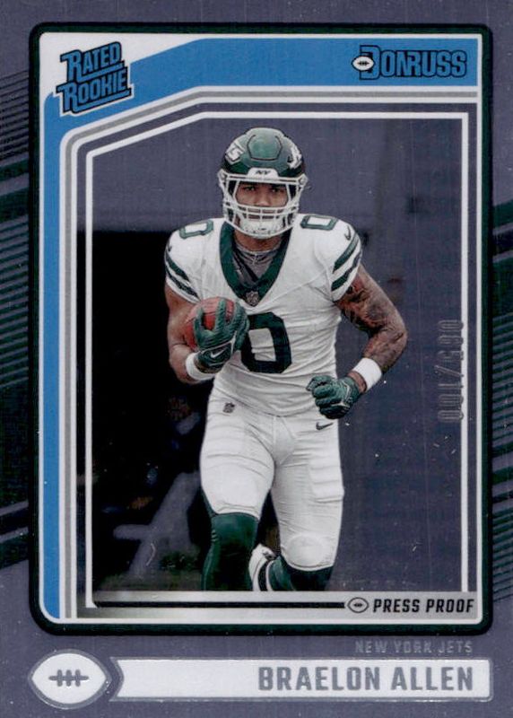 The Braelon Allen 2024 Donruss #306 Press Proof Silver /100 Rookie card in Raw condition has not changed in price in the last 30 days and was last sold for $4.99 .