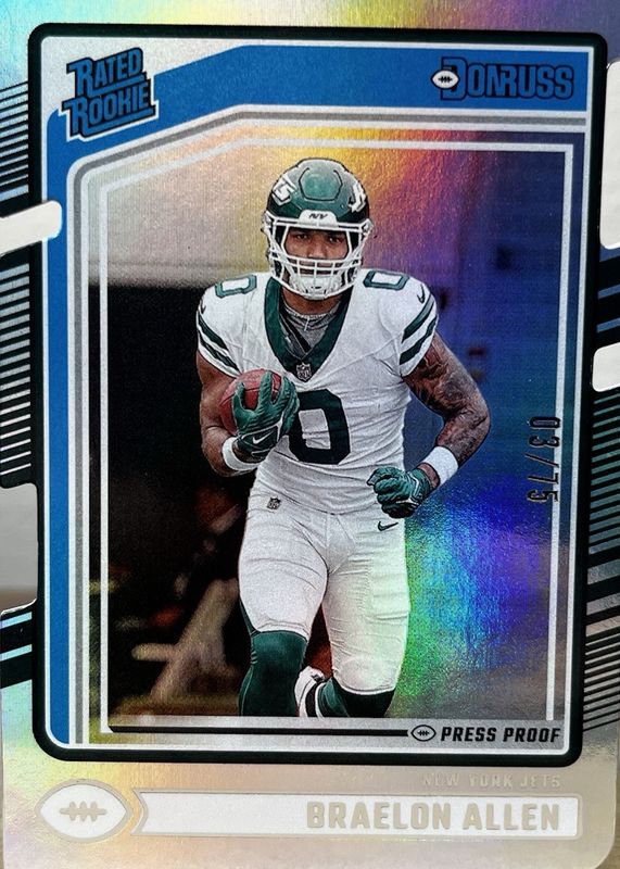 The Braelon Allen 2024 Donruss #306 Press Proof Silver Die-Cut /75 Rookie card in Raw condition has not changed in price in the last 30 days and was last sold for $10.00 .