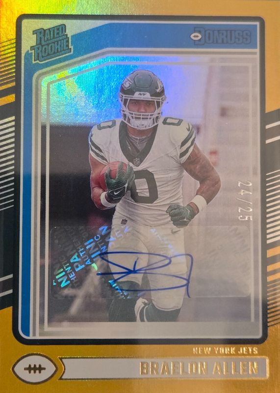 The Braelon Allen 2024 Donruss #306 Rated Rookie Autographs - Gold /25 card in Raw condition has not changed in price in the last 30 days and was last sold for $12.70 .
