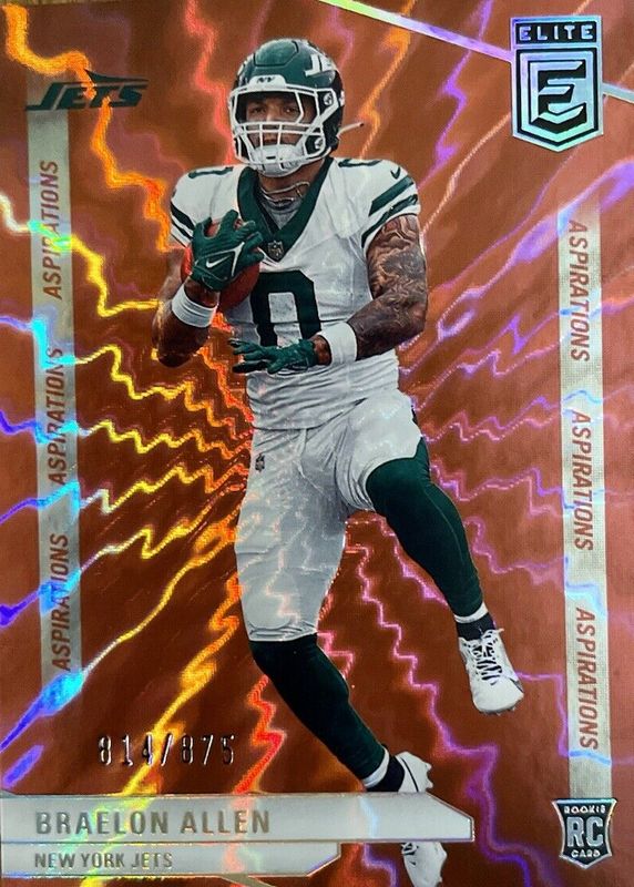 The Braelon Allen 2024 Elite #194 Aspirations Shimmer /875 Rookie card in Raw condition has not changed in price in the last 30 days and was last sold for $1.99 .