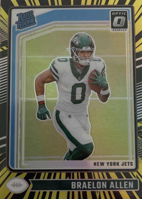 This card is 1 of 65 Braelon Allen's card variations in the 2024 Optic set being tracked by Sports Card Investor, including Base, Blue Hyper, Blue Scope, Green Hyper, and Green Velocity.