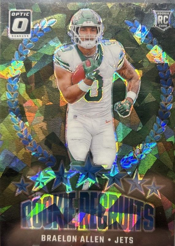 The Braelon Allen 2024 Optic #18 Rookie Recruits - Ice /15 card in Raw condition has not changed in price in the last 30 days and was last sold for $11.50 .