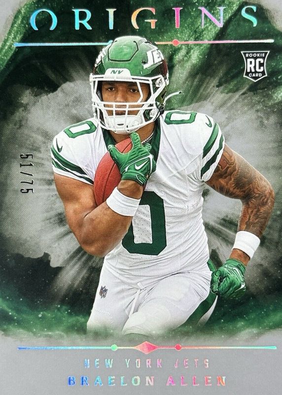 This card is 1 of 20 Braelon Allen's card variations in the 2024 Origins set being tracked by Sports Card Investor, including Base, Holo Red /299, Holo Orange /149, Red /149, and Orange /125.