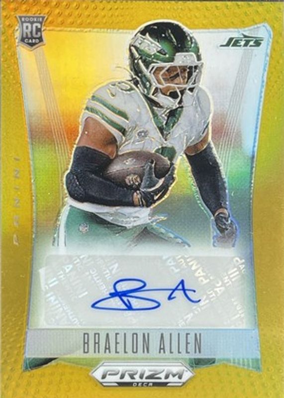 The Braelon Allen 2024 Prizm Deca #S-BAN Signatures - Gold /10 Rookie card in Raw condition has not changed in price in the last 30 days and was last sold for $78.00 .