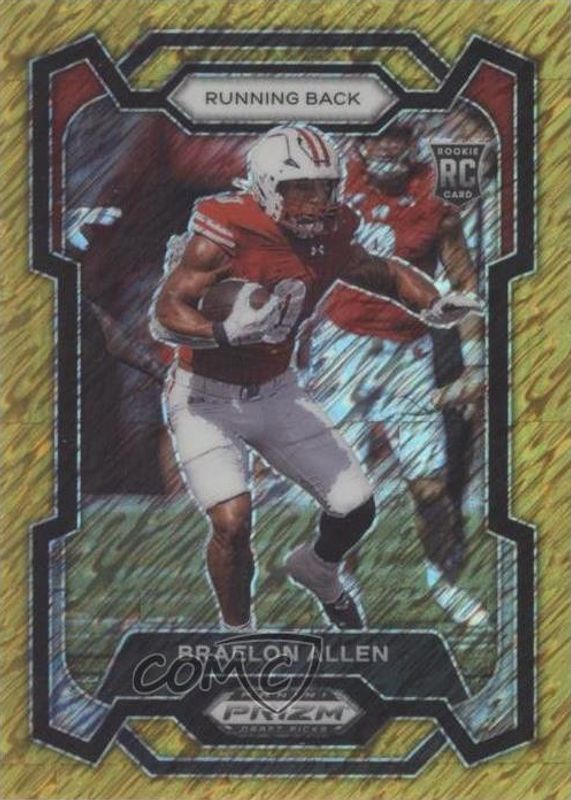 The Braelon Allen 2024 Prizm Draft Picks #129 Gold Shimmer /15 Rookie card in Raw condition has not changed in price in the last 30 days and was last sold for $58.04 .