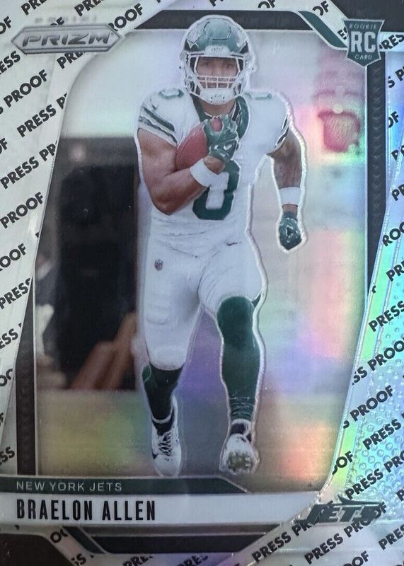 The Braelon Allen 2024 Prizm #311 Press Proof /(SSP) Rookie card in Raw condition has not changed in price in the last 30 days and was last sold for $35.00 .