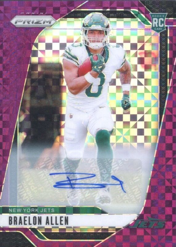 The Braelon Allen 2024 Prizm #311 Rookie Autographs - Purple Power /49 card in Raw condition has not changed in price in the last 30 days and was last sold for $26.00 .