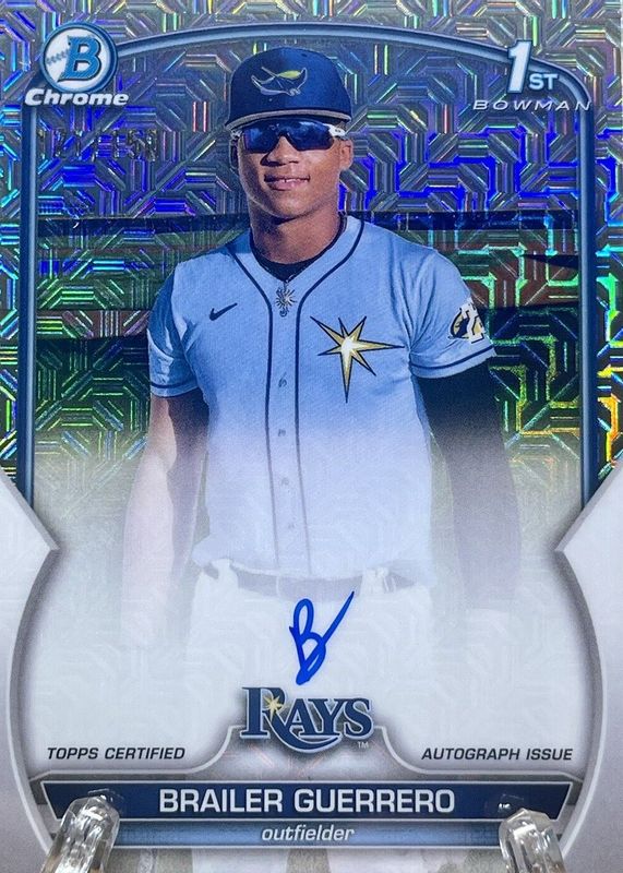 This card is 1 of 20 Brailer Guerrero's card variations in the 2023 Bowman Chrome set being tracked by Sports Card Investor, including Prospect Auto (1st), Prospect Auto - Refractor /499 (1st), Prospect Auto - Speckle Refractor /299 (1st), Prospect Auto - Purple Refractor /250 (1st), and Prospect Auto - Blue RayWave Refractor /150 (1st).