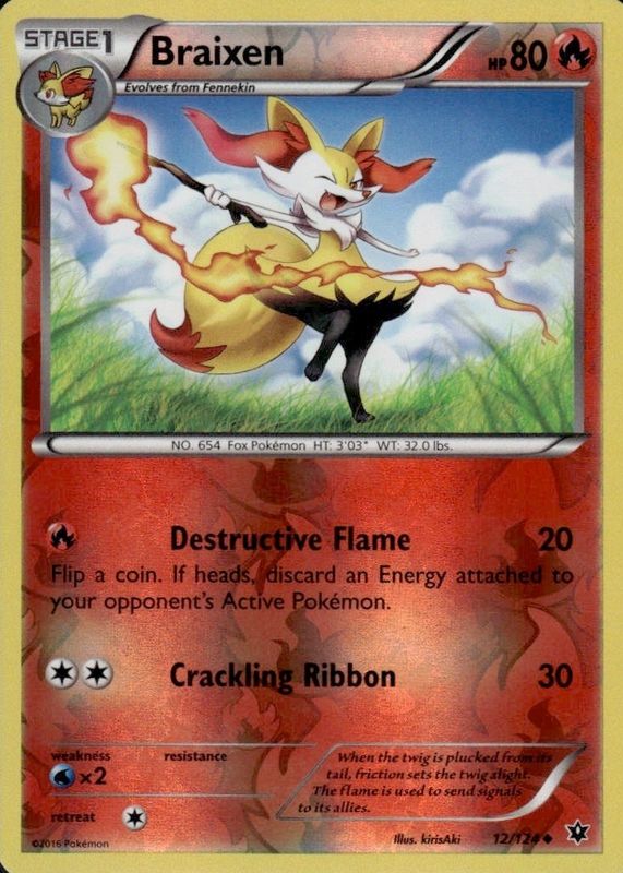 The Braixen 2016 XY: Fates Collide #012/124 Reverse Holo card in Raw TCG (Lightly Played) condition has not changed in price in the last 30 days and was last sold for $2.99 .