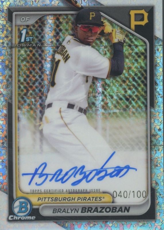 This card is 1 of 25 Bralyn Brazoban's card variations in the 2024 Bowman Chrome set being tracked by Sports Card Investor, including Prospect Auto (1st), Prospect Auto - Refractor /499 (1st), Prospect Auto - Speckle Refractor /299 (1st), Prospect Auto - Purple Refractor /250 (1st), and Prospect Auto - Blue RayWave Refractor /150 (1st).