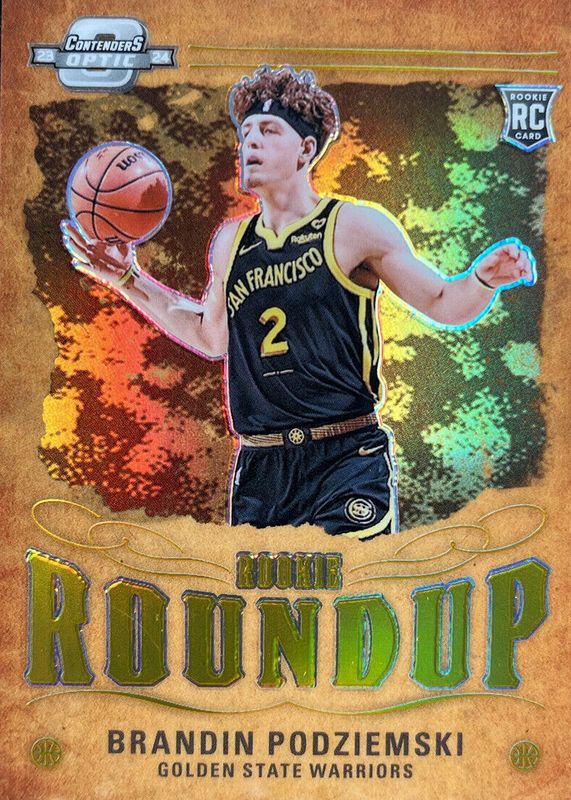 The Brandin Podziemski 2023 Contenders Optic #14 Rookie Roundup - Gold /10 card in Raw condition has not changed in price in the last 30 days and was last sold for $16.00 .