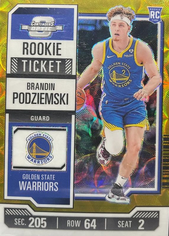 The Brandin Podziemski 2023 Contenders Optic #3 Rookie Ticket - Gold /10 card in Raw condition has moved down -$8.00 (-19.5%) in the last 30 days and was last sold for $33.00 .