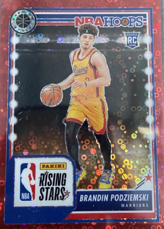 The Brandin Podziemski 2023 Hoops Premium Stock #297 Rising Stars - Red Disco /149 Rookie card in Raw condition has not changed in price in the last 30 days and was last sold for $18.00 .