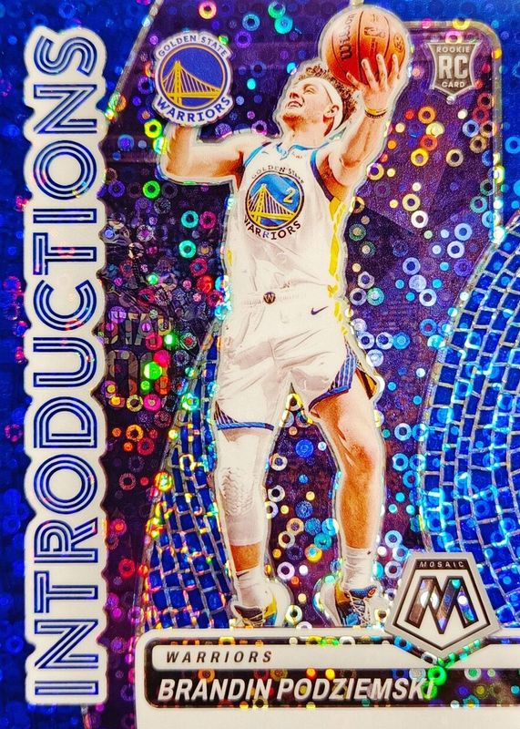 The Brandin Podziemski 2023 Mosaic #16 Introductions - Fast Break Blue /85 Rookie card in Raw condition has not changed in price in the last 30 days and was last sold for $1.60 .