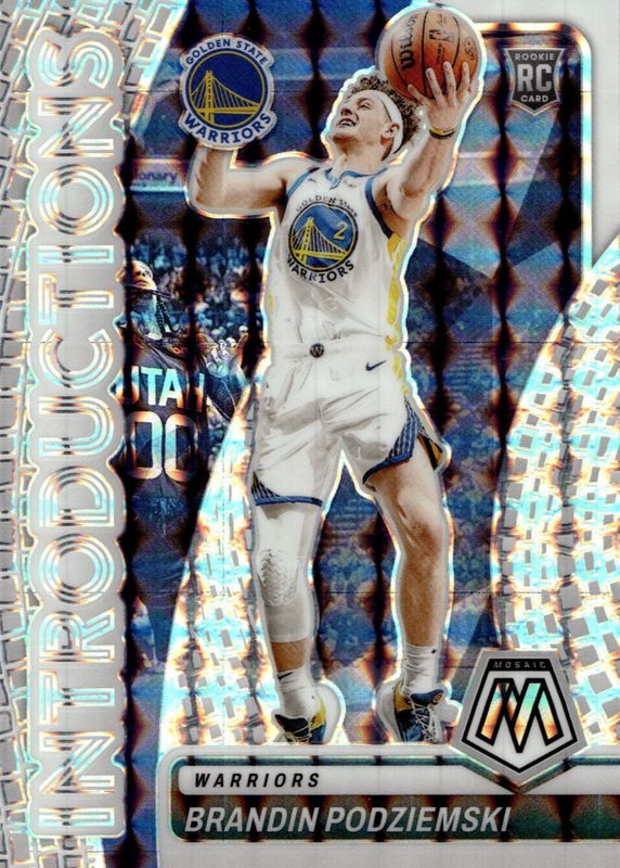 The Brandin Podziemski 2023 Mosaic #16 Introductions - White /25 Rookie card in Raw condition has not changed in price in the last 30 days and was last sold for $31.00 .