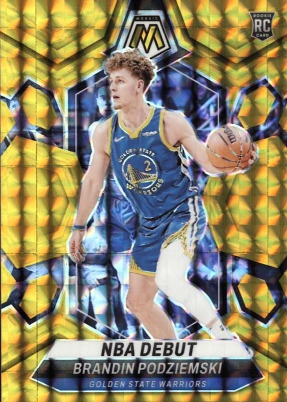 The Brandin Podziemski 2023 Mosaic #266 NBA Debut - Gold /10 Rookie card in Raw condition has not changed in price in the last 30 days and was last sold for $27.00 .