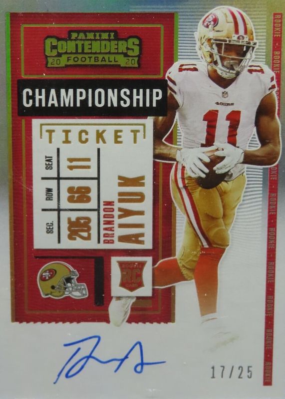 The Brandon Aiyuk 2020 Contenders #110 Rookie Ticket Auto Variation - Championship Ticket /25 card in Raw condition has not changed in price in the last 30 days and was last sold for $130.00 .