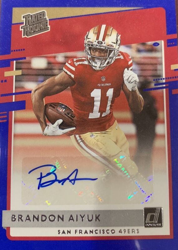 The Brandon Aiyuk 2020 Donruss #319 Rated Rookie Autographs - Blue card in Raw condition has not changed in price in the last 30 days and was last sold for $34.99 .