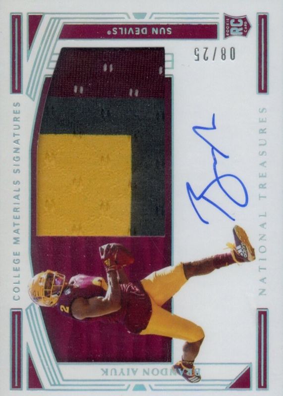 This card is 1 of 49 Brandon Aiyuk's card variations in the 2020 National Treasures set being tracked by Sports Card Investor, including Rookie Patch Auto /99, Rookie Patch Auto - Green Jersey Number (/11), Rookie Patch Auto - Holo Silver /25, Rookie Patch Auto - Midnight /20, and Rookie Patch Auto - Stars & Stripes /20.