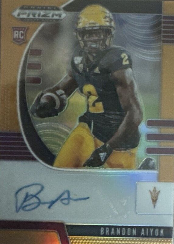 The Brandon Aiyuk 2020 Prizm Draft Picks #255 Autographs - Neon Orange (/149) Rookie card in Raw condition has not changed in price in the last 30 days and was last sold for $14.19 .