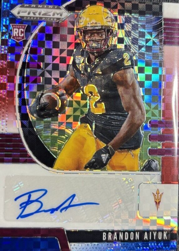 The Brandon Aiyuk 2020 Prizm Draft Picks #255 Autographs - Red White Blue (/99) Rookie card in Raw condition has not changed in price in the last 30 days and was last sold for $25.00 .