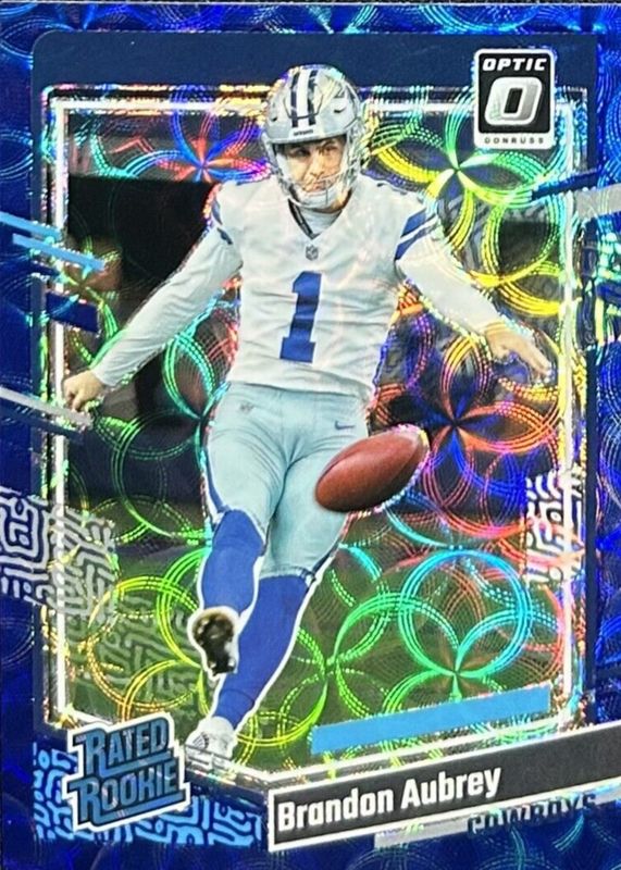 The Brandon Aubrey 2023 Optic #226 Blue Scope Rookie card in Raw condition has moved down -$2.74 (-54.9%) in the last 30 days and was last sold for $2.25 .