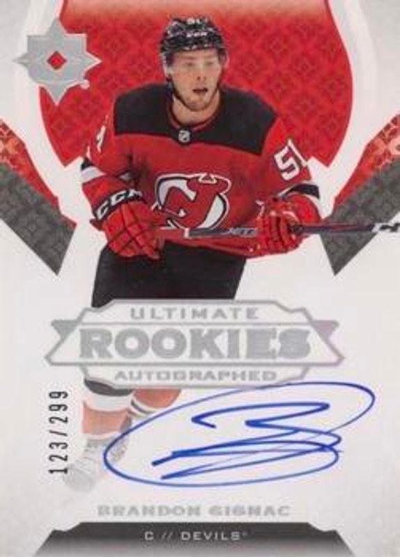 The Brandon Gignac 2019 Upper Deck Ultimate Collection #106 Base /299 Rookie card is 1 of 9 Brandon Gignac's card variations in the 2019 Upper Deck Ultimate Collection set being tracked by Sports Card Investor, including Autographed Shields /1, Ultimate Introductions, Ultimate Introductions Gold Autographs, Ultimate Rookies Jersey /399, and Ultimate Rookies Auto Patch /99.