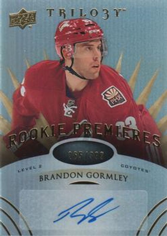 The Brandon Gormley 2014 Upper Deck Trilogy #143 Base /799 Rookie card is 1 of 19 Brandon Gormley's card variations in the 2014 Upper Deck Trilogy set being tracked by Sports Card Investor, including #176 Base /799, #110 Base /799, #176 Radiant Blue /499, #110 Radiant Blue /499, and #143 Radiant Blue /499.