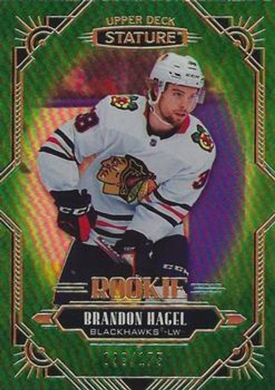 The Brandon Hagel 2020 Upper Deck Stature #182 Green /175 Rookie card is 1 of 8 Brandon Hagel's card variations in the 2020 Upper Deck Stature set being tracked by Sports Card Investor, including Base /399, Portrait /99, Red /85, Blue /45, and Portrait Red /25.