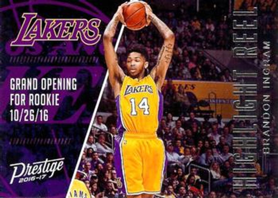 The Brandon Ingram 2016 Prestige #9 Highlight Reel Rookie card is 1 of 26 Brandon Ingram's card variations in the 2016 Prestige set being tracked by Sports Card Investor, including Base, Crystal, Horizon, Metallized, and Rain.