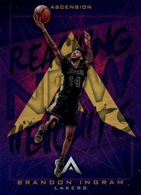 The Brandon Ingram 2017 Ascension #RN-BI Reaching New Heights card is 1 of 9 Brandon Ingram's card variations in the 2017 Ascension set being tracked by Sports Card Investor, including Base, Blue /125, Red /75, Green /25, and Black /1.