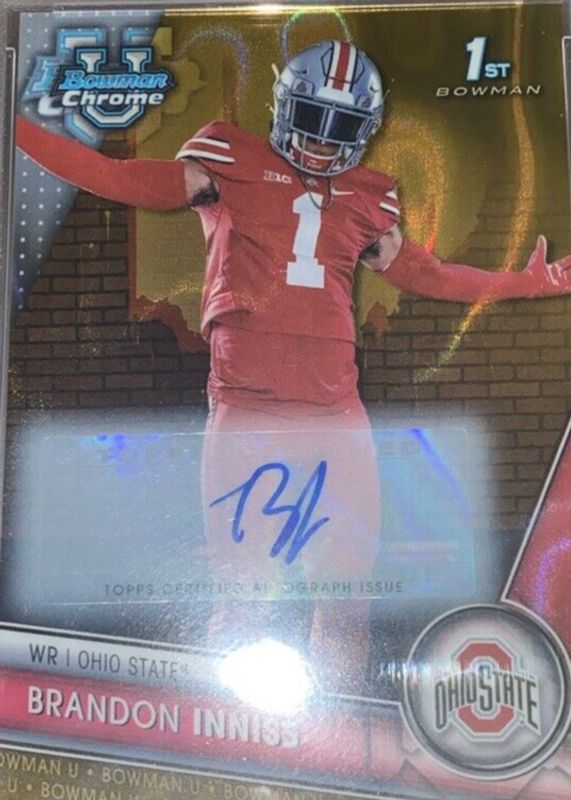 This card is 1 of 12 Brandon Inniss' card variations in the 2023 Bowman Chrome University set being tracked by Sports Card Investor, including Prospect Auto (1st), Prospect Auto - Refractor /499 (1st), Prospect Auto - Fuchsia Mini-Diamond Refractor /150 (1st), Prospect Auto - Green Refractor /99 (1st), and Prospect Auto - Yellow Refractor /75 (1st).