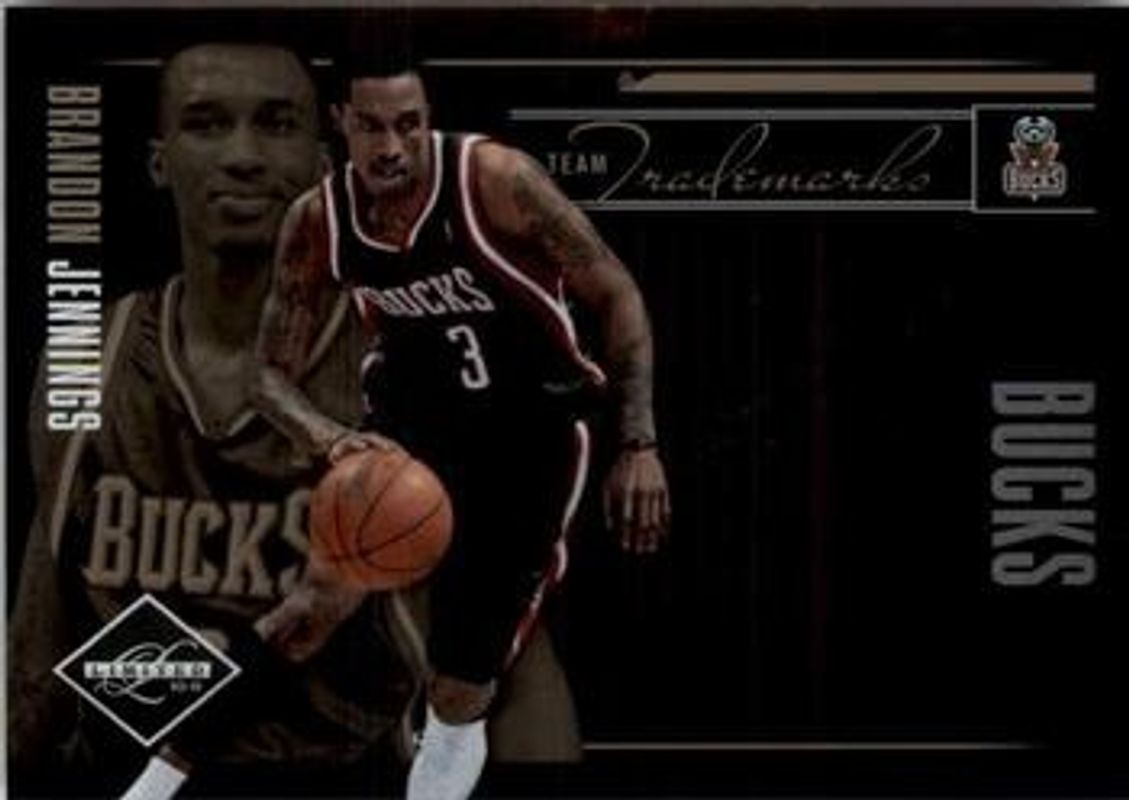 The Brandon Jennings 2010 Limited #2 Team Trademarks /149 card is 1 of 25 Brandon Jennings' card variations in the 2010 Limited set being tracked by Sports Card Investor, including Base /199, Silver Spotlight /149, Gold Spotlight /49, Platinum Spotlight /1, and Banner Season /149.