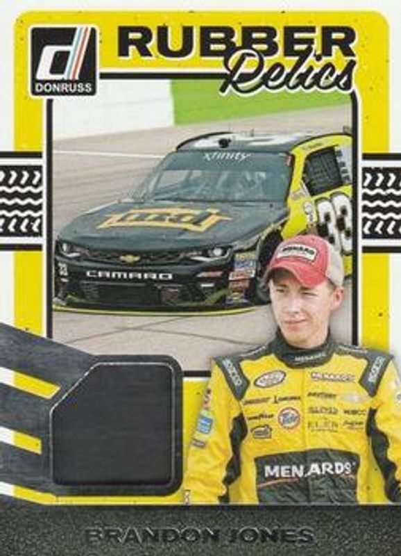 The Brandon Jones 2017 Donruss NASCAR #RR-BJ Rubber Relics card is 1 of 9 Brandon Jones' card variations in the 2017 Donruss NASCAR set being tracked by Sports Card Investor, including Retro Relics 1984, Signatures Series, Rubber Relics Holo Gold /99, Retro Relics 1984 Holo Gold /25, and Signatures Series Holo Gold /25.