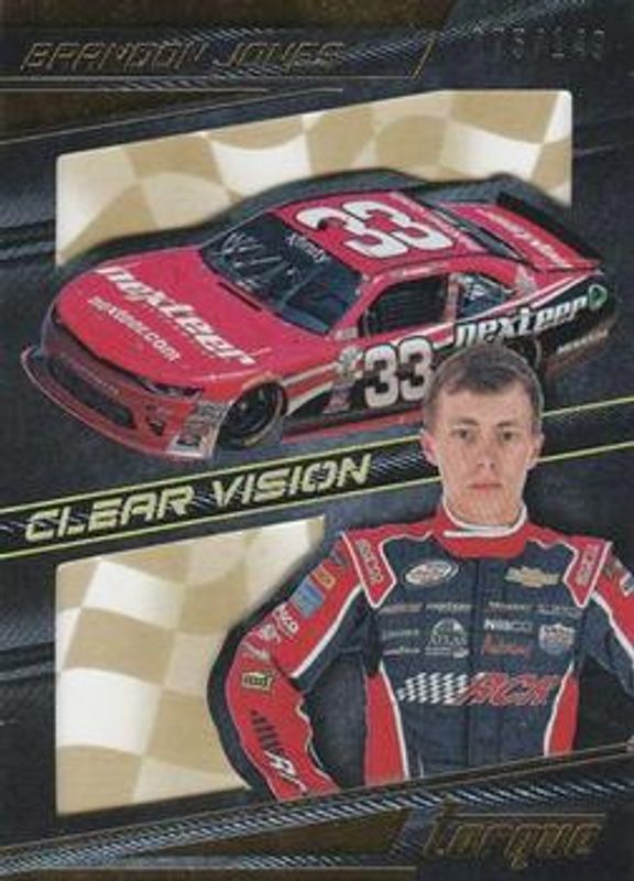 The Brandon Jones 2017 Torque NASCAR #37 Clear Vision Gold /149 card is 1 of 30 Brandon Jones' card variations in the 2017 Torque NASCAR set being tracked by Sports Card Investor, including Base, Gold, Blue /150, Red /100, and Artist Proof /75.