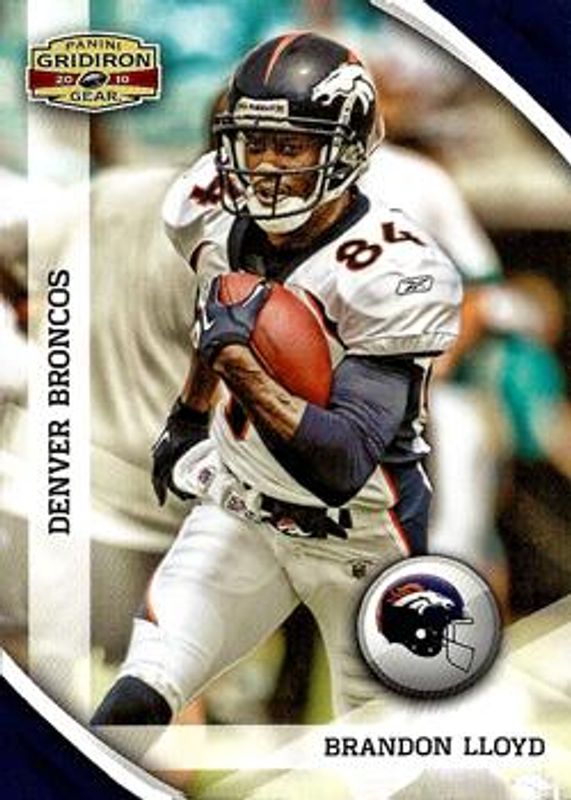 The Brandon Lloyd 2010 Gridiron Gear #42 Base /244 card is 1 of 7 Brandon Lloyd's card variations in the 2010 Gridiron Gear set being tracked by Sports Card Investor, including Silver O's /250, Silver X's /250, Gold O's /100, Gold X's /100, and Platinum O's /25.