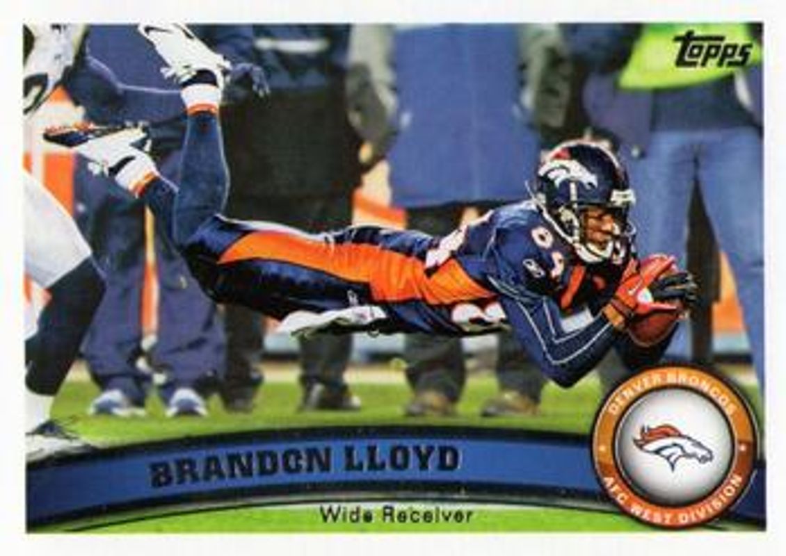 The Brandon Lloyd 2011 Topps #265 Base card is 1 of 13 Brandon Lloyd's card variations in the 2011 Topps set being tracked by Sports Card Investor, including Gold /2011, Red /77, Black /55, Platinum /1, and Printing Plates Black /1.