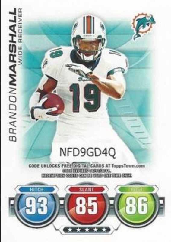 The Brandon Marshall 2010 Topps Attax Code Cards card is 1 of 3 Brandon Marshall's card variations in the 2010 Topps Attax set being tracked by Sports Card Investor, including Base, and Superstars Foil.