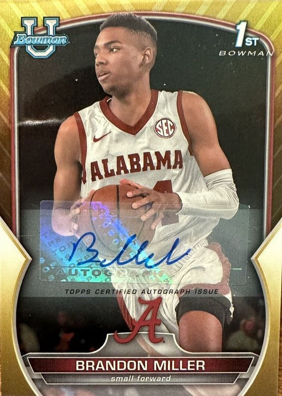 2022-23 BOWMAN CHROME UNIVERSITY BRANDON MILLER GOLD REFRACTOR AUTO RC /50 BAMA