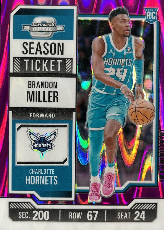 The Brandon Miller 2023 Contenders Optic #11 Season Ticket - Purple /15 Rookie card in Raw condition has not changed in price in the last 30 days and was last sold for $17.50 .